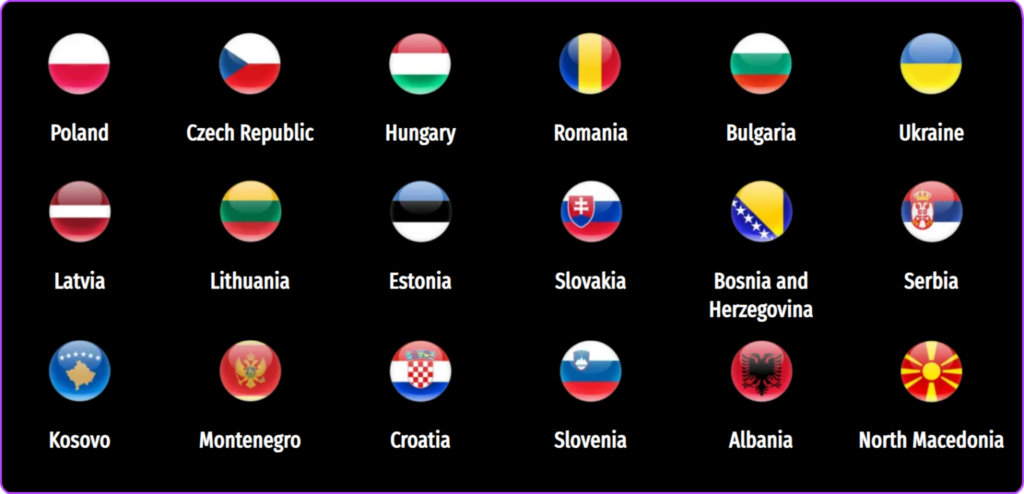 Poljska, Češka, Bugarska, Hrvatska, Estonija, Mađarska, Kosovo, Letonija, Litvanija, Crna Gora, Severna Makedonija, Rumunija, Srbija, Slovačka, Slovenija, Ukrajina, Albanija i Bosna i Hercegovina.