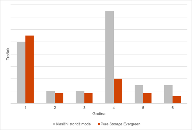 Na slici 1. predstavljena je uporedna analiza uobičajene TCO računice za vlasništvo nad storidž sistemom i Pure Storage//Evergreen programa.